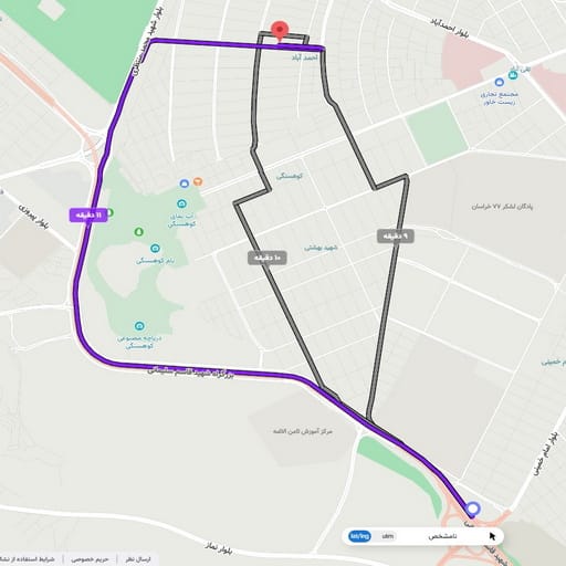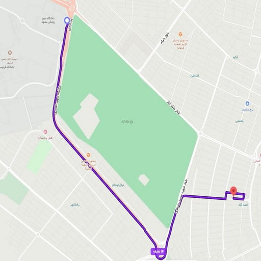 بلوار فرودگاه – پل حافظ – میدان تلویزیون -بلوار شهید منتظری سه راهی سمت راست -بلوار بعثت بعد از چهارراه دوم